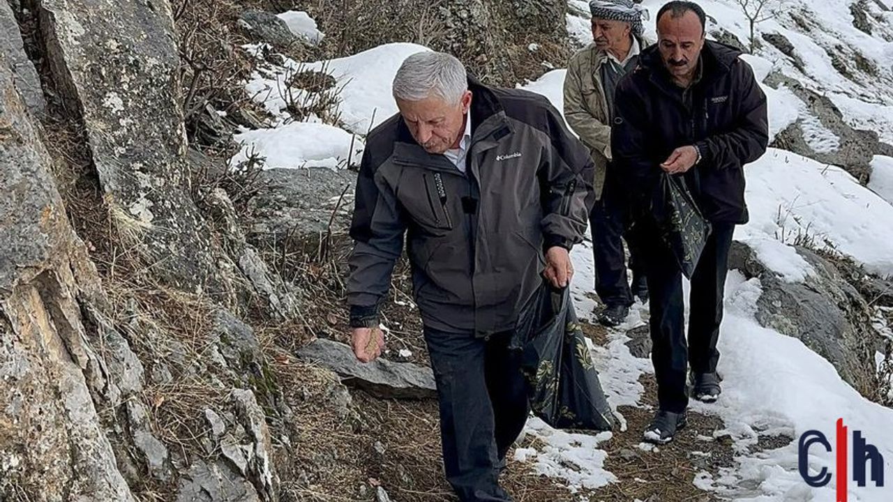Kekliklerin aç kalmaması için Hakkâri merkezden yem temin eden Özbek, köylüler ve arkadaşlarıyla birlikte doğaya yem bıraktı.