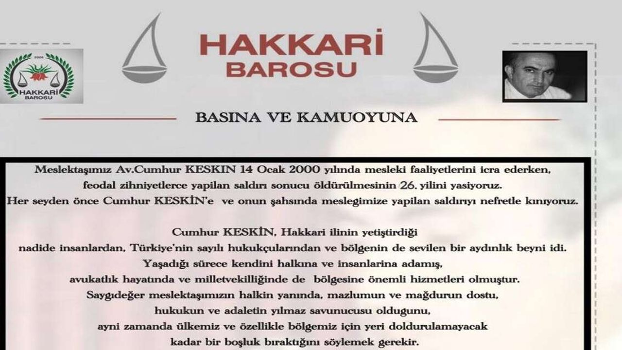 Hakkari Barosu açıklamasını, “Saygıdeğer meslektaşımız Av. Cumhur Keskin’i saygı ve rahmetle anıyoruz” sözleriyle tamamladı.