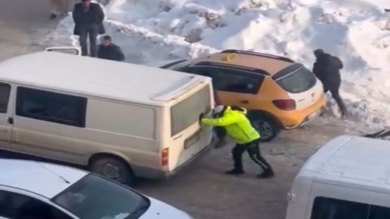 Edinilen bilgilere göre, tekerlekleri buzda boş dönmeye başlayan kamyonet, bir süre yolda mahsur kaldı. Durumu fark eden trafik polisi, hemen aracı kurtarmak için harekete geçti. Polis memuru, soğuk havaya aldırış etmeden kamyonetin arkasına geçerek aracı itmeye başladı.