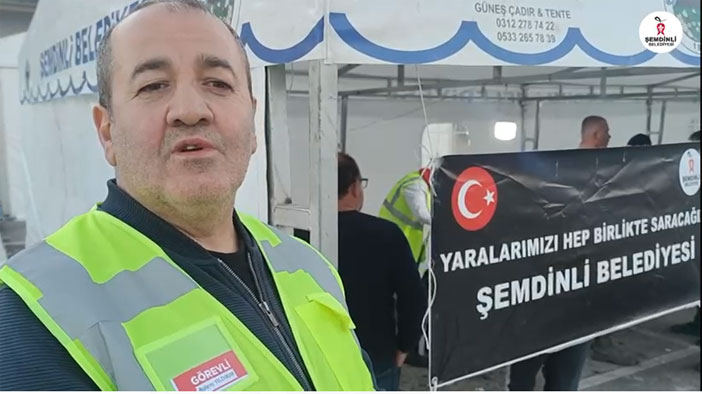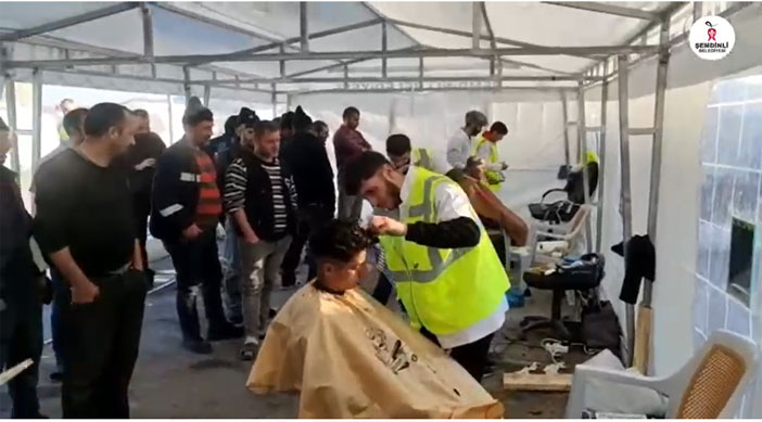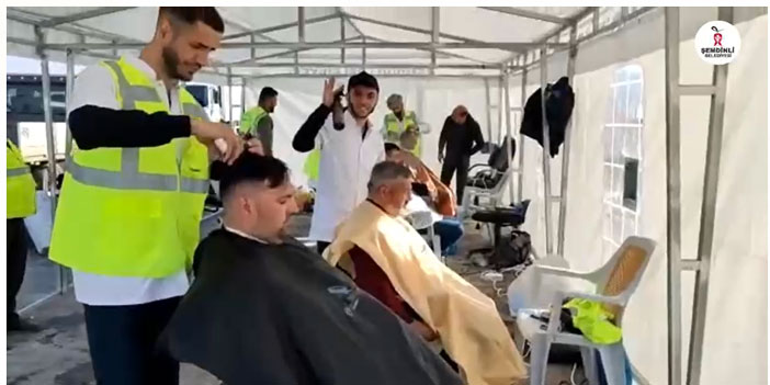 “Bugün insani bir yardım için Hatay’dayız' diyen Başkan Saklı Şemdinli Belediyesi olarak kurdukları çadırda çalışan 10 berber ve kuaförün vatandaşları ücretsiz tıraş ettiklerini söyledi.