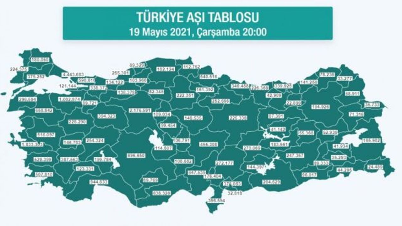 Sağlık Bakanlığının "covid19asi.saglik.gov.tr" adresinde yer alan anlık verilere göre, 19 Mayıs saat 19.45 itibarıyla uygulanan birinci doz aşı 15 milyon 430 bin 414, ikinci doz aşı 11 milyon 481 bin 752 oldu. Böylece toplam doz miktarı 26 milyon 912 bin 166 olarak gerçekleşti.